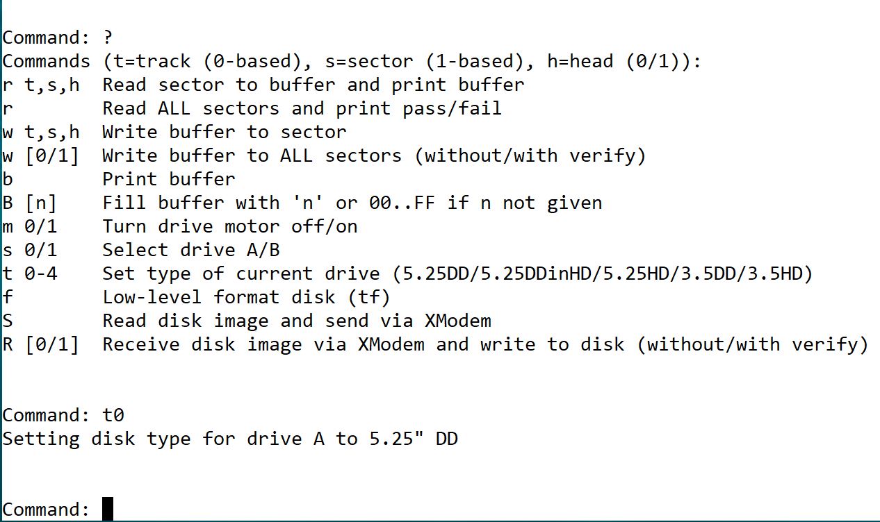 Es bietet ein Mini DOS und einen Low Level Monitor mit dem man per xmodem track und Disk dumps empfangen (und auch senden kann)