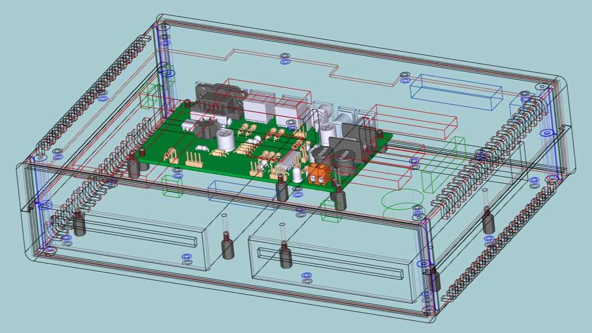 Im Deckel 'hängt' das PCW-Mainboard, das sind die blauen, grünen und roten Blöcke, das Mainboard ist braun. Die zwei Floppy-Drives stehen in der Bodenschale und sind schwarz. Ledigich das PCW-IO ist in Massivdarstellung zu sehen, gewissenmaßen als Orientierungshilfe. Das Boarddesign ist so bei zwei Drives nicht zu gebrauchen, ich brauche es aber zum Testen und der Lage der Anschlußbuchsen wegen. Anhand der Draufsicht kann ich als nächstes das Outline des neuen Boards festlegen und dann das Layout neu gestalten. Aus Kollisionsgründen stehen die Drives auf 10mm Hexagonstützen, das PCW-IO auf 7mm Stützen. Auf diese Weise ist sichergestellt, das im Falle von Routing-Problemen die Leiterplatte notfalls vergrößert und unter die Laufwerke erweitert werden kann. Für Bauteile unterhalb der Laufwerke ist die 'Deckenhöhe' des Gehäuses zu gering, aber unter die Drives solle auch nichts. Der zur Verfügung stehende Platz dahinter (da wo die Buchsen sind) und zwischen den Laufwerken sollte/muß ausreichen.