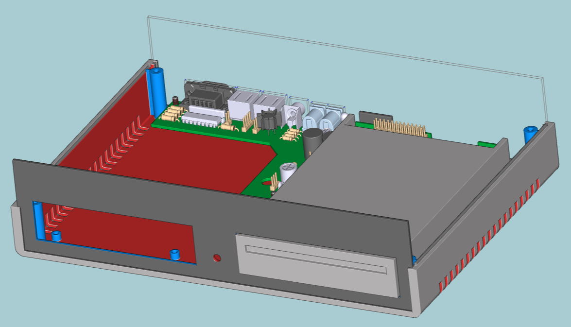Ich habe noch etwas an der Hardware weiter gefeilt und jetzt einen Stand erreicht, von dem ich Glaube, das er zu 99% final ist. Um hier nicht alles mit Bildern vollzumüllen, sind die Ansicht in einem zip zusammengefaßt. Seht euch das mal an. Derzeit ist nicht berücksichtigt, 3"-Laufwerke ins Gehäuse einzusetzen - die habe ich nicht, dementsprechend kann ich sie auch mechanisch nicht berücksichtigen. Ansonsten kann 3.5"-Floppy und GOTEK pur oder gemischt eingebaut werden. Der originäre PCW-Drucker müßte auch gehen (die 24V werden geliefert). Nach genauerer Betrachtung der Schaltpläne dürfte der Drucker nicht mehr als 1,2A max. aufnehmen, ansonsten schlägt beim original-PCW eine Überstromabschaltung zu. Insofern bin ich guter Hoffnung, dass das auch funktionieren wird (das letzte Wort hat hier aber der Praxistest - den ich aber mangels PCW-Drucker nicht durchführen kann). Ev. kann man das ja auf dem nächsten Bitte-8-Bit-Treffen machen, das ist jedenfalls die Deadline, die ich vor Augen habe. Für die DC-Versorgung der Box wird wohl ein 12V/5A-Netzteil standard werden, damit Drucker, Box und ein kleiner VGA-Monitor (mit 12V-DC) versorgt werden können. Derartige Netzteile gibt's bei eBay. Das wär's ersteinmal für dieses Jahr