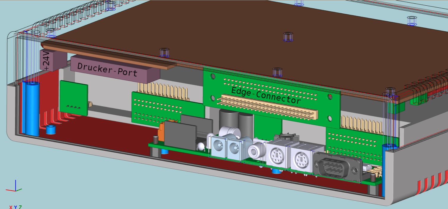 Ich habe noch etwas an der Hardware weiter gefeilt und jetzt einen Stand erreicht, von dem ich Glaube, das er zu 99% final ist. Um hier nicht alles mit Bildern vollzumüllen, sind die Ansicht in einem zip zusammengefaßt. Seht euch das mal an. Derzeit ist nicht berücksichtigt, 3"-Laufwerke ins Gehäuse einzusetzen - die habe ich nicht, dementsprechend kann ich sie auch mechanisch nicht berücksichtigen. Ansonsten kann 3.5"-Floppy und GOTEK pur oder gemischt eingebaut werden. Der originäre PCW-Drucker müßte auch gehen (die 24V werden geliefert). Nach genauerer Betrachtung der Schaltpläne dürfte der Drucker nicht mehr als 1,2A max. aufnehmen, ansonsten schlägt beim original-PCW eine Überstromabschaltung zu. Insofern bin ich guter Hoffnung, dass das auch funktionieren wird (das letzte Wort hat hier aber der Praxistest - den ich aber mangels PCW-Drucker nicht durchführen kann). Ev. kann man das ja auf dem nächsten Bitte-8-Bit-Treffen machen, das ist jedenfalls die Deadline, die ich vor Augen habe. Für die DC-Versorgung der Box wird wohl ein 12V/5A-Netzteil standard werden, damit Drucker, Box und ein kleiner VGA-Monitor (mit 12V-DC) versorgt werden können. Derartige Netzteile gibt's bei eBay. Das wär's ersteinmal für dieses Jahr :lol: