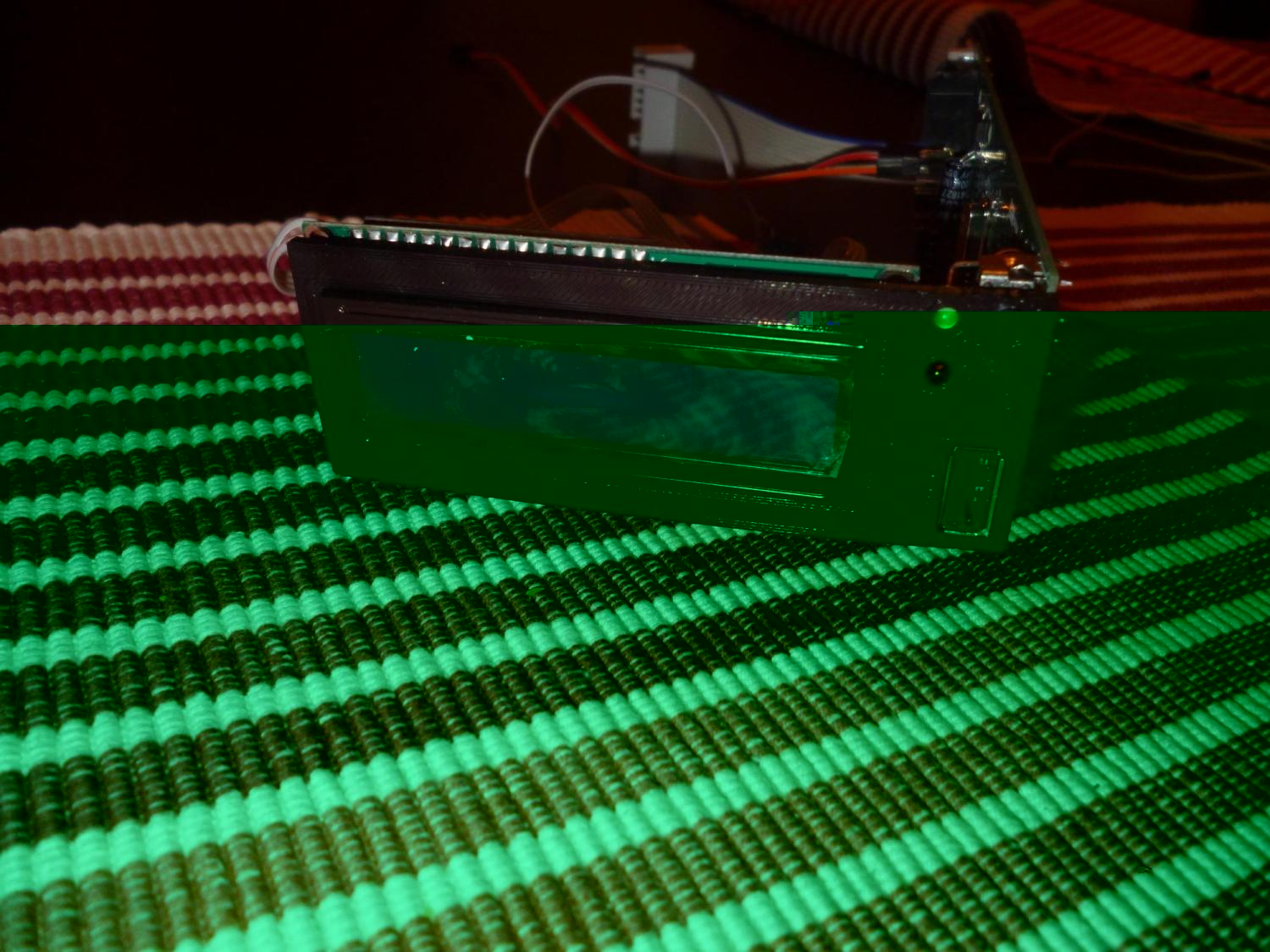 Auf der Vorderseite habe ich neben dem neuen USW-Laufwerk drei Löcher für Schalter gebohrt. Die oberste Bohrung ist für den noch fehlenden dritten Taster des USB-Laufwerks bestimmt. Zur Zeit hängen noch die beiden Kabel raus, den Kontakt stelle ich im Moment noch dadurch her, dass ich die Kabel kurz aneinander halte. Angeschlossen sind die beiden Kabel an der Jumperposition "JA", wie man auf einem der Bilder sieht.
