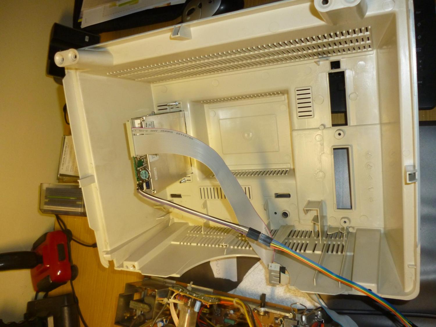 Mein Gotek sieht dem Flopper inzwischen schon etwas ähnlich. Ich habe eine Blende für das Display, USB-Anschluss und die zwei Schalter entworfen und mit einem 3D-Drucker ausdrucken lassen. Das Gotek-Gehäuse habe ich mit der Flex zugeschnitten und mit Heißkleber ein paar Streben angeklebt. Anschließend habe ich es in den freien Laufwerksschacht des Joyce-Gehäuses eingebaut. Auf der Rückseite des Gehäuses habe ich ein 3,5"-Laufwerk eingebaut.