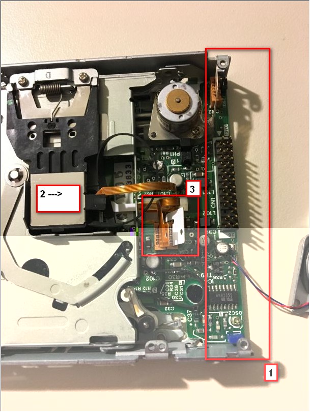 Die Flexkabel (3) ausstecken ist ebenfalls ein gute Idee. Blöd nur, wenn durch das Alter des Laufwerks sich die weisse, aufgeklebte Verstärkung verabschiedet - ohne diese bekommt man die Flexkabel nicht mehr in die Sockel. Auch so ein Spass.