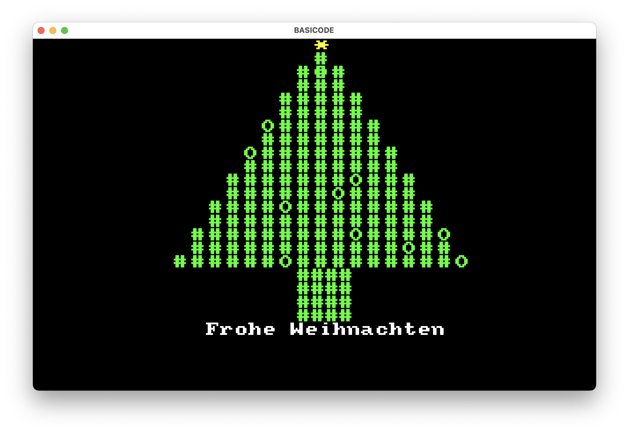 Einen computereigenen BASIC-Betrieb gibt es in der Java-Implementierung (derzeit) nicht; die ist als reine Ausführumgebung von BASIC- bzw. BASICODE-Programmen gedacht. Eine komplette BASIC-Umgebung mit Eingabeaufforderung etc. zu bauen, war nie meine Absicht.ein Thüringer hat geschrieben: ↑26.12.2023, 21:44 Ein kleiner Änderungswunsch für Dein Programm: es läuft ungebremst in das GOTO 950 hinein. Laut Vereinbarungen ... wird mit dem Rückführen in den computereigenen Basic-Betrieb aber auch der Bildschirm gelöscht (das wird Michael bestimmt noch hineinarbeiten), der Baum ist also eigentlich augenblicklich wieder fort. Wenn Du vor das GOTO 950 noch ein GOSUB 210 setzt, passiert das erst nach beliebigem Tastendruck.