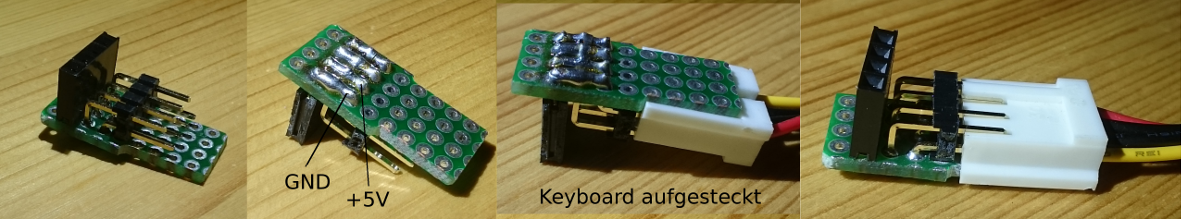 Mit einem ähnlichen Adapter kannst Du auch die +5V vom Keyboard-Anschluß abgreifen. Dann wird kein extra Netzteil benötigt und Du hast eine in sich geschlossene Lösung. Ich würde aber trotzdem anraten, den Modulator im Moitorgehäuse zu installieren und dessen BAS-Ausgang nach außen führen. Es reicht vielleicht ja schon, wenn ein Kabel mit angeflanschter RCA-Buchse an der Rückseite bummelt - nicht schön, geht aber. Im nachfolgenden Bild ein möglicher Adapter für die +5V. Fürs Video wärs ähnlich, auf der einen Pin-Reihe NSync zu Video-Teil des Monitors, auf der anderen Reihe beide Signale zum Modulator.